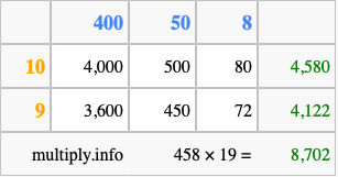 That's all there is to it! As you can see from the box above, the answer to 458 times 19 using the box method is 8,702.