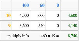 Finally, we add up all the sums we found in step 3 to get our final answer to 460 times 19.