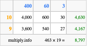 Finally, we add up all the sums we found in step 3 to get our final answer to 463 times 19.