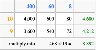That's all there is to it! As you can see from the box above, the answer to 468 times 19 using the box method is 8,892.