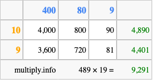 Below is an illustration showing you how to calculate 489 times 19 using the box method, using the instructions above.