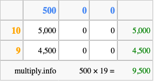 That's all there is to it! As you can see from the box above, the answer to 500 times 19 using the box method is 9,500.