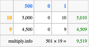 Finally, we add up all the sums we found in step 3 to get our final answer to 501 times 19.
