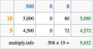 Below is an illustration showing you how to calculate 508 times 19 using the box method, using the instructions above.