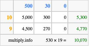 Below is an illustration showing you how to calculate 530 times 19 using the box method, using the instructions above.