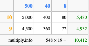 Below is an illustration showing you how to calculate 548 times 19 using the box method, using the instructions above.