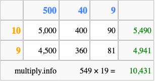 Below is an illustration showing you how to calculate 549 times 19 using the box method, using the instructions above.