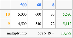 Below is an illustration showing you how to calculate 568 times 19 using the box method, using the instructions above.