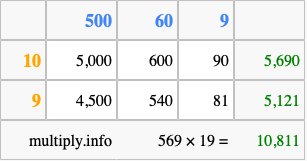 Below is an illustration showing you how to calculate 569 times 19 using the box method, using the instructions above.