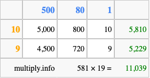 Below is an illustration showing you how to calculate 581 times 19 using the box method, using the instructions above.