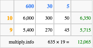 That's all there is to it! As you can see from the box above, the answer to 635 times 19 using the box method is 12,065.