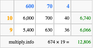 Finally, we add up all the sums we found in step 3 to get our final answer to 674 times 19.