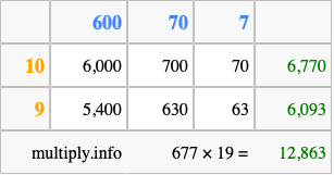 That's all there is to it! As you can see from the box above, the answer to 677 times 19 using the box method is 12,863.