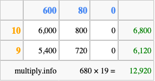 That's all there is to it! As you can see from the box above, the answer to 680 times 19 using the box method is 12,920.