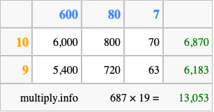 Below is an illustration showing you how to calculate 687 times 19 using the box method, using the instructions above.