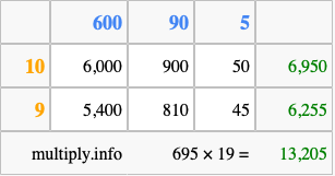 Below is an illustration showing you how to calculate 695 times 19 using the box method, using the instructions above.