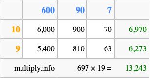 Below is an illustration showing you how to calculate 697 times 19 using the box method, using the instructions above.