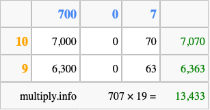 Finally, we add up all the sums we found in step 3 to get our final answer to 707 times 19.