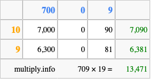 That's all there is to it! As you can see from the box above, the answer to 709 times 19 using the box method is 13,471.