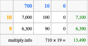 Below is an illustration showing you how to calculate 710 times 19 using the box method, using the instructions above.