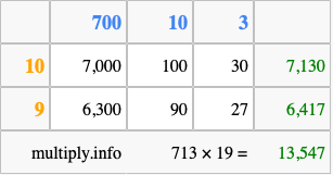 Below is an illustration showing you how to calculate 713 times 19 using the box method, using the instructions above.