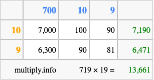Below is an illustration showing you how to calculate 719 times 19 using the box method, using the instructions above.