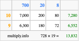 That's all there is to it! As you can see from the box above, the answer to 728 times 19 using the box method is 13,832.