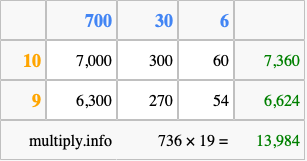 Below is an illustration showing you how to calculate 736 times 19 using the box method, using the instructions above.