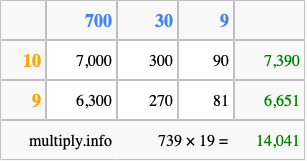 Below is an illustration showing you how to calculate 739 times 19 using the box method, using the instructions above.