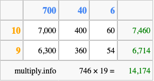 That's all there is to it! As you can see from the box above, the answer to 746 times 19 using the box method is 14,174.