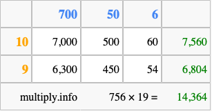 That's all there is to it! As you can see from the box above, the answer to 756 times 19 using the box method is 14,364.