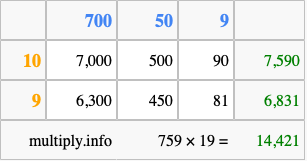 Below is an illustration showing you how to calculate 759 times 19 using the box method, using the instructions above.