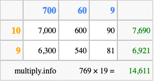 Below is an illustration showing you how to calculate 769 times 19 using the box method, using the instructions above.