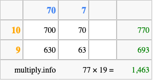 That's all there is to it! As you can see from the box above, the answer to 77 times 19 using the box method is 1,463.