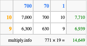 Below is an illustration showing you how to calculate 771 times 19 using the box method, using the instructions above.
