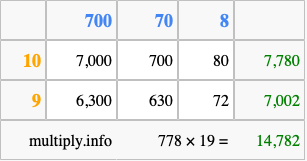 Below is an illustration showing you how to calculate 778 times 19 using the box method, using the instructions above.