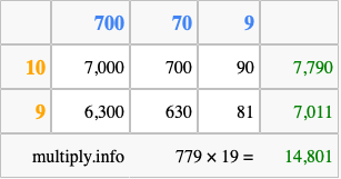 Below is an illustration showing you how to calculate 779 times 19 using the box method, using the instructions above.