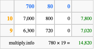 Below is an illustration showing you how to calculate 780 times 19 using the box method, using the instructions above.