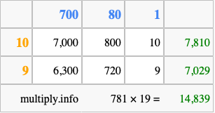 Below is an illustration showing you how to calculate 781 times 19 using the box method, using the instructions above.