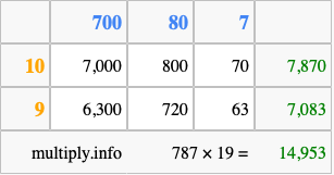 Below is an illustration showing you how to calculate 787 times 19 using the box method, using the instructions above.
