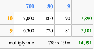 Finally, we add up all the sums we found in step 3 to get our final answer to 789 times 19.