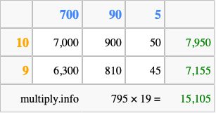 Below is an illustration showing you how to calculate 795 times 19 using the box method, using the instructions above.