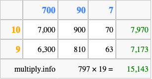 Below is an illustration showing you how to calculate 797 times 19 using the box method, using the instructions above.
