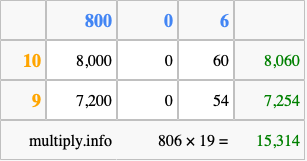 Below is an illustration showing you how to calculate 806 times 19 using the box method, using the instructions above.