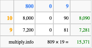 Below is an illustration showing you how to calculate 809 times 19 using the box method, using the instructions above.