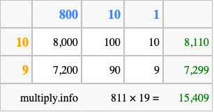 Below is an illustration showing you how to calculate 811 times 19 using the box method, using the instructions above.