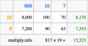 Below is an illustration showing you how to calculate 817 times 19 using the box method, using the instructions above.