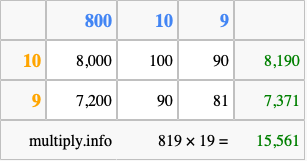 That's all there is to it! As you can see from the box above, the answer to 819 times 19 using the box method is 15,561.
