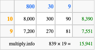Below is an illustration showing you how to calculate 839 times 19 using the box method, using the instructions above.