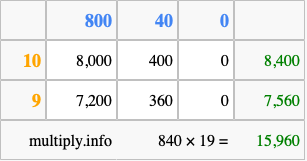 Finally, we add up all the sums we found in step 3 to get our final answer to 840 times 19.
